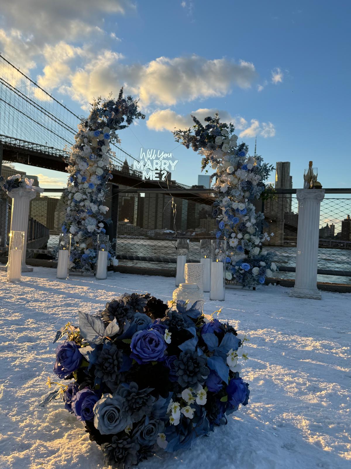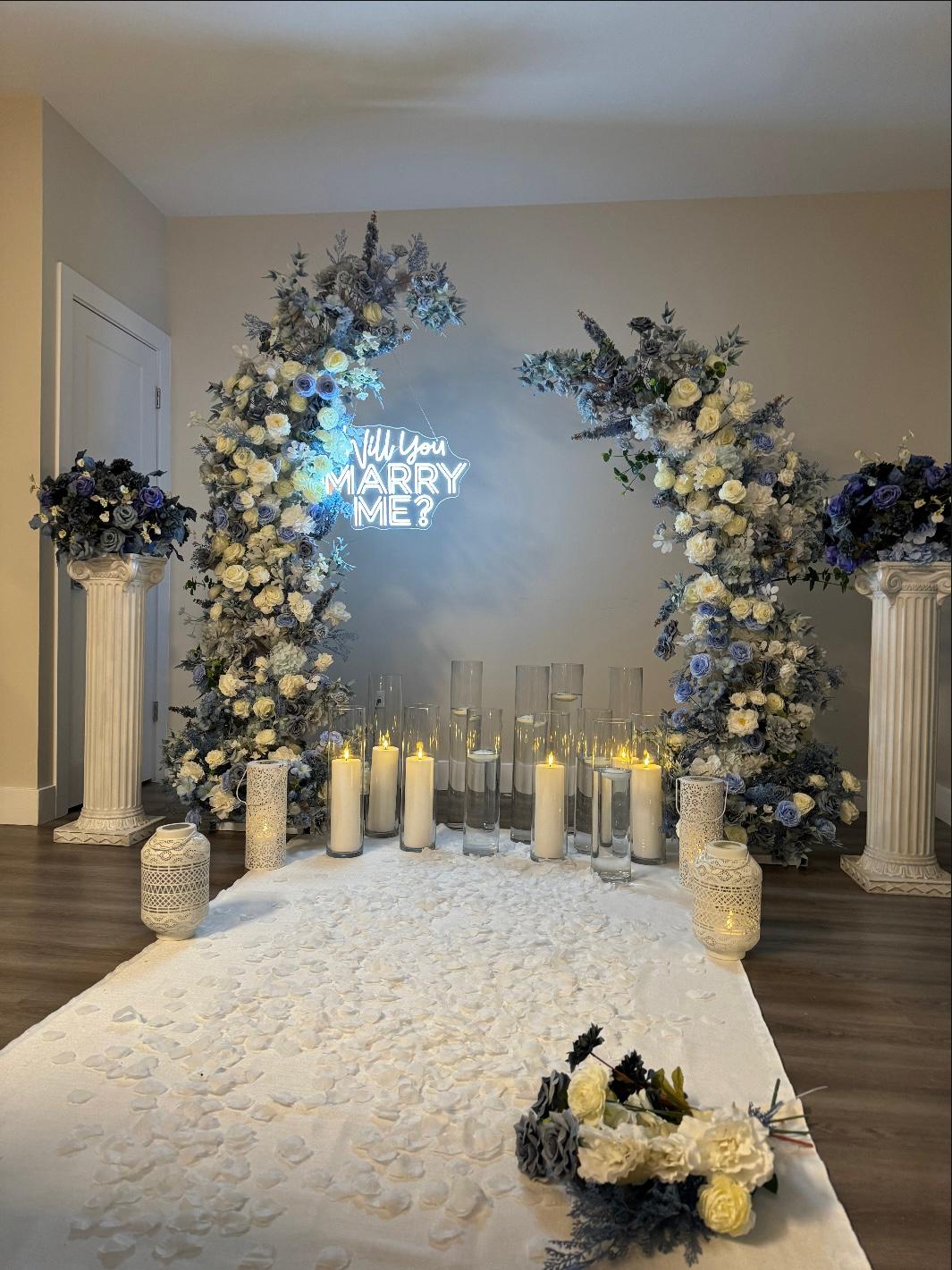 Elegant Central Design: The centerpiece features two elegant wave-shaped floral arches in soft blue and white tones, embracing the “Will You Marry Me” sign — a breathtaking view reminiscent of the sea.